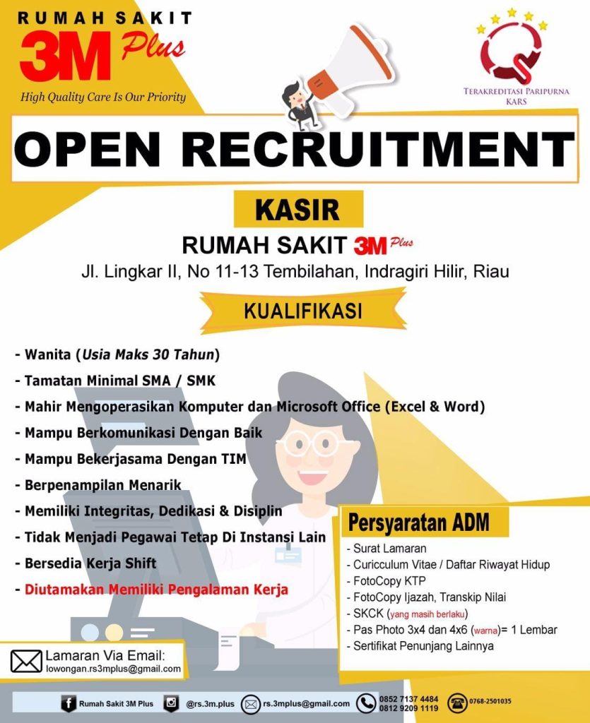 ARB INdonesia, INDRAGIRI HILIR – Rumah Sakit 3M Plus Tembilahan, Kabupaten Indragiri Hilir (Inhil) kembali membuka lowongan pekerjaan (Lowker) bagi siapa saja yang memiliki keahlian di bidang yang dibutuhkan.