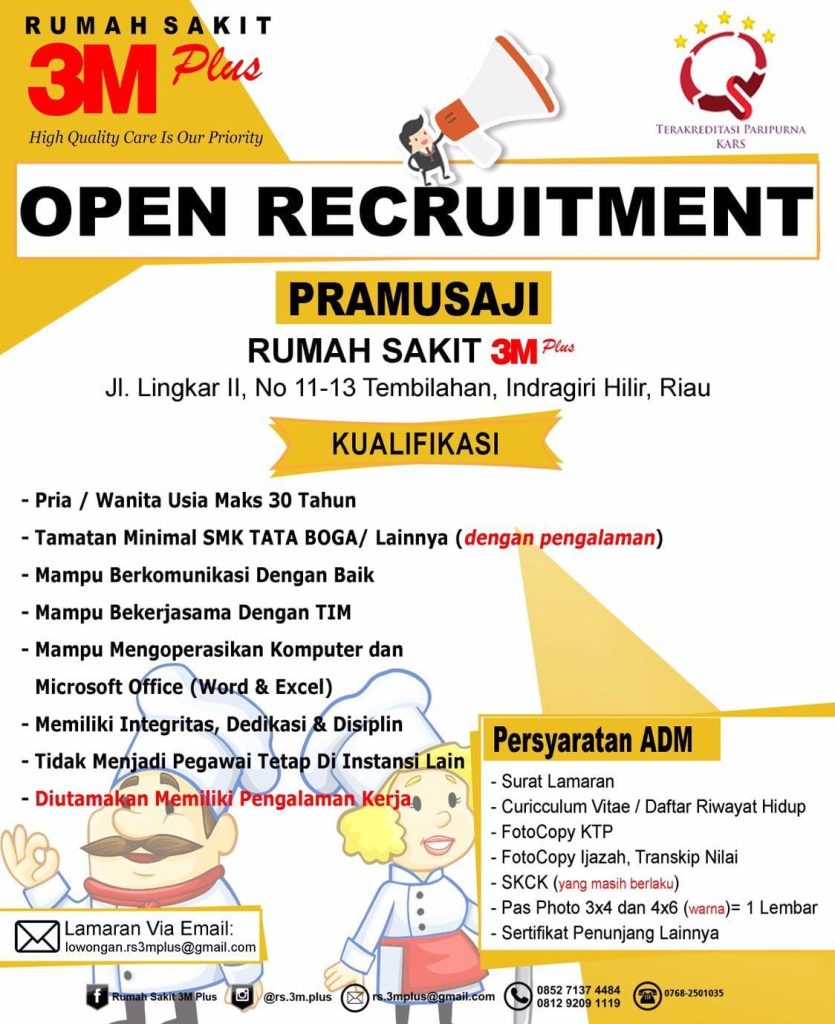 Kali ini, Rumah Sakit Swasta yang telah memiliki Akreditasi PARIPURNA tersebut tengah membutuhkan tengah membutuhkan tenaga kerja baru baik Pria maunpun Wanita untuk mengisi pada bagian KASIR dan PRAMUSAJI.