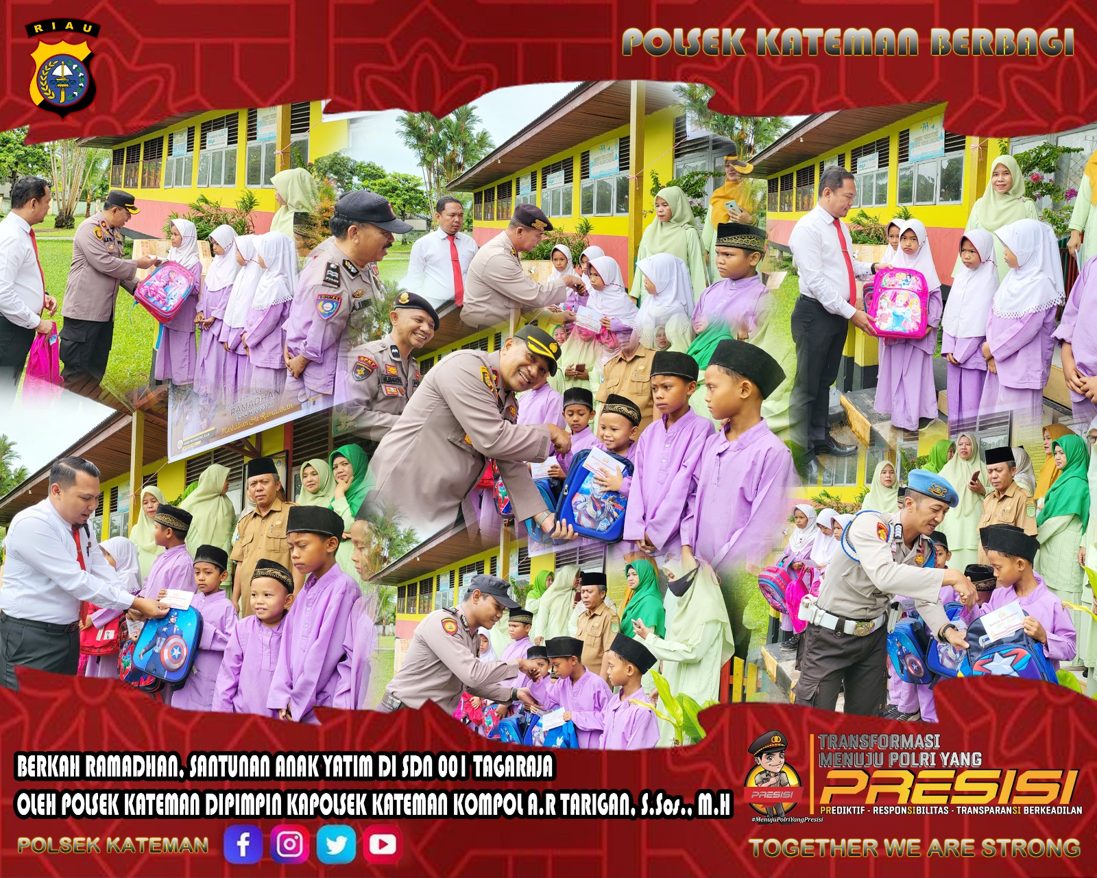 ARB INdonesia, INDRAGIRI HILIR – Wujud syukur dalam kegiatan Berkah Ramadhan, Polsek Kateman menyantuni anak yatim di Sekolah Dasar Negeri (SDN) 001 Kelurahan Tegaraja, Kecamatan Kateman, Kabupaten Indragiri Hilir (Inhil).