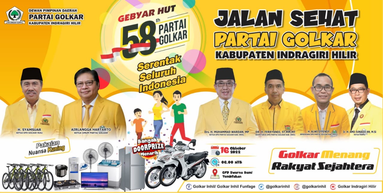 ARB INdonesia, INDRAGIRI HILIR – Dewan Pimpinan Daerah (DPD) Partai Golongan Karya (Golkar) Kabupaten Indragiri Hilir akan melaksanakan kegiatan Jalan Sehat serentak se-Indonesia terbuka untuk umum. Hal itu dilakukan dalam rangka memperingati dan memeriahkan Hari Ulang Tahun (HUT) ke – 58 Partai Golkar.