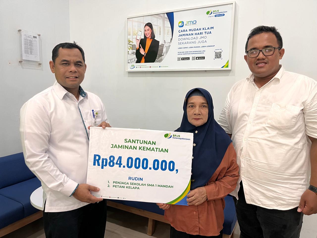Indragiri Hilir, mediaekspresDalam. Co. BPJS Ketenagakerjaan (BPJamsostek) Cabang Indragiri Hilir kembali menunjukkan komitmennya dalam memberikan perlindungan bagi pekerja dengan menyalurkan santunan Jaminan Kematian (JKM) kepada ahli waris peserta yang meninggal dunia. Kali ini, santunan sebesar Rp84 juta diberikan kepada keluarga almarhum Rudin, seorang pekerja dengan dua profesi sebagai penjaga sekolah di SMA Negeri 1 Mandah dan petani kelapa (2 kartu kepesertaan).senin(17/2/2025)