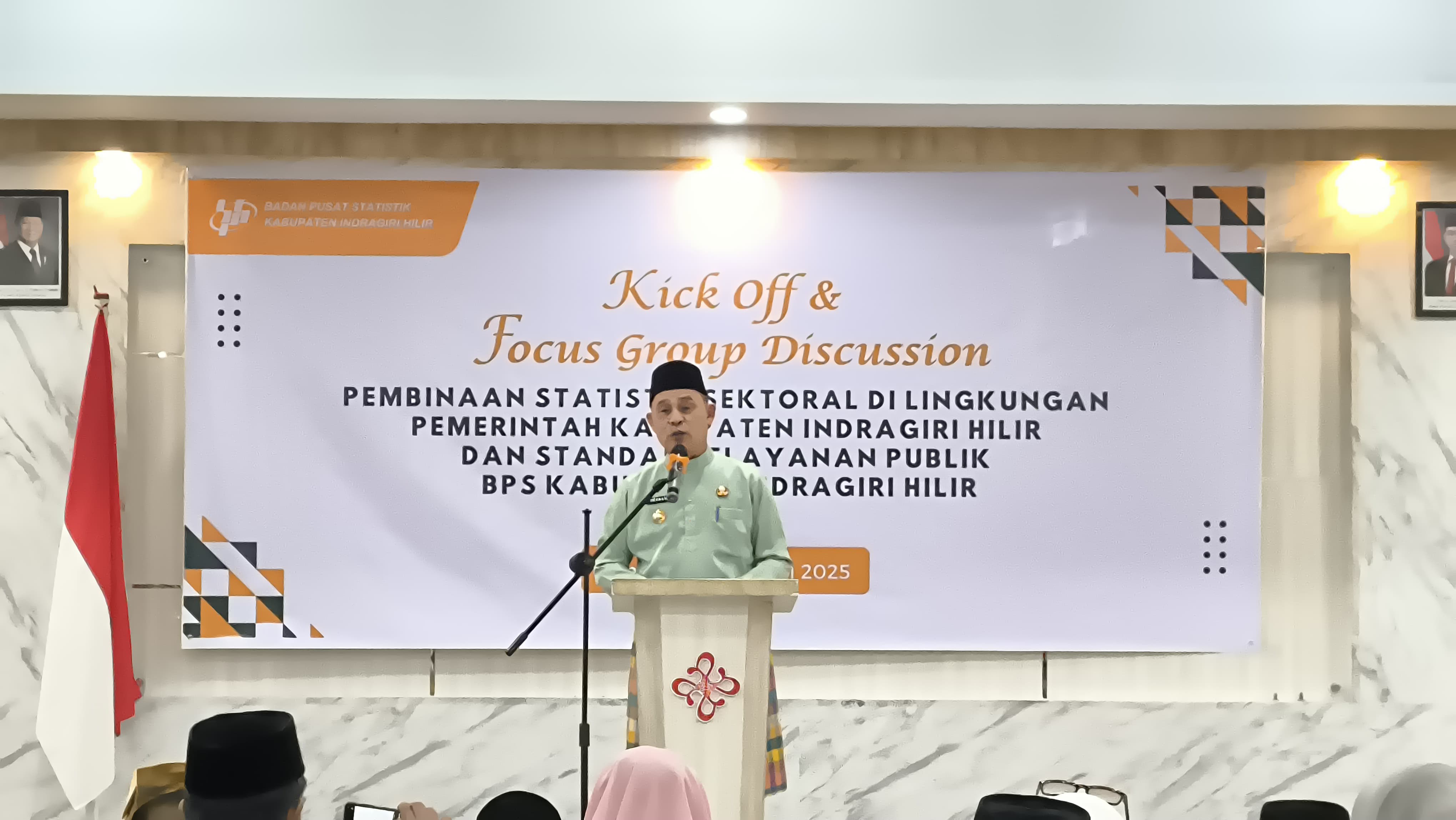 Inhil, media ekspres. Co. Bupati Indragiri Hilir, H. Herman, menghadiri dan membuka secara resmi kegiatan Kick Off Forum Group Discussion (FGD) Pembinaan Statistik Sektoral di lingkungan Pemerintah Kabupaten Indragiri Hilir serta Standar Pelayanan Publik Badan Pusat Statistik (BPS) Kabupaten Indragiri Hilir. Acara berlangsung pada Jumat, 16 Mei 2025, di Aula Hotel Harmona Inn, Tembilahan, mulai pukul 08.00 WIB hingga selesai.