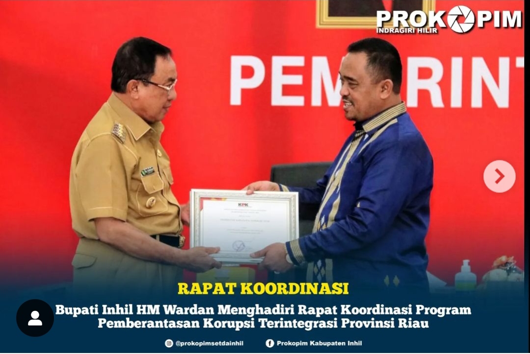 ARB INdonesia, INDRAGIRI HILIR – Bupati Indragiri Hilir Drs. HM Wardan didampingi Sekretaris Daerah H. Afrizal dan OPD terkait di lingkungan Pemkab. Inhil menghadiri Rapat Koordinasi Program Pemberantasan Korupsi Terintegrasi Pimpinan KPK – Kepala Daerah Se-Provinsi Riau yang dilaksanakan di Balai Serindit Komp. Gubernuran Pekanbaru, Selasa 30 Agustus 2022.