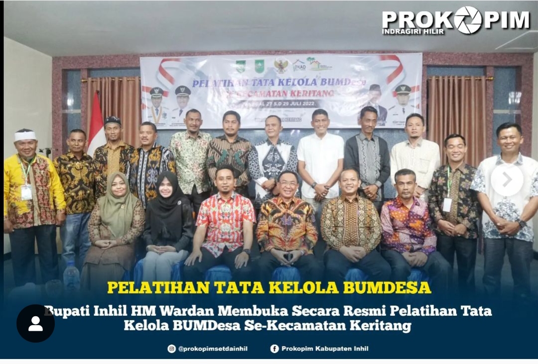 Bupati Inhil HM Wardan dalam sambutannya menyambut baik dan mengapresiasi atas dilaksanakannya kegiatan pelatihan tata kelola BUMDesa se Kecamatan Keritang tahun 2022 ini.