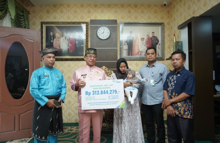 ARB INdonesia, INDRAGIRI HILIR – Badan Penyelenggara Jaminan Sosial Ketenagakerjaan (BPJamsostek) Cabang Indragiri Hilir pada Jumat pagi (12/5) menyerahkan santunan kematian melalui Bupati Indragiri Hilir Drs.HM Wardan MP di Rumah Dinas Bupati Indragiri Hilir Tembilahan.
