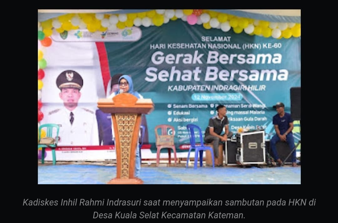 Kepala Dinas Kesehatan Kabupaten Indragiri Hilir, Rahmi Indrasuri, SKM, MKL, menyampaikan bahwa peringatan HKN merupakan upaya pemerintah untuk memaksimalkan pelayanan kesehatan promotif dan preventif bagi masyarakat.