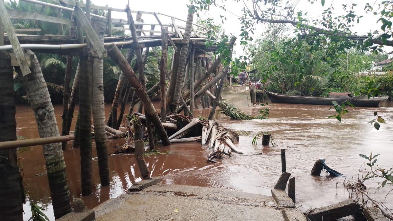 ARB INdonesia, INDRAGIRI HILIR – Dinas Pekerjaan Umum dan Tata Ruang (PUTR) Kabupaten Indragiri Hilir (Inhil) turun langsung melihat kondisi jembatan roboh di Desa Lahang Tengah, Kecamatan Gaung.