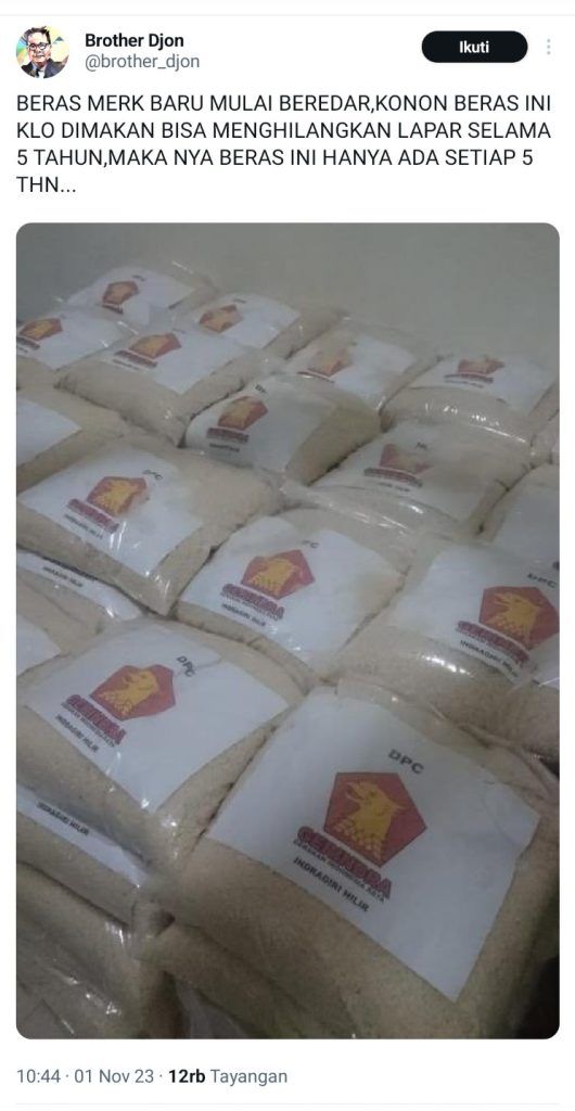 Dari penelusuran media ARB INdonesia, ternyata foto Beras bermerek DPC Gerindra Inhil yang di upload oleh pemilik akun twitter Brother Djon merupakan foto yang sudah ada sejak tahun 2020.
