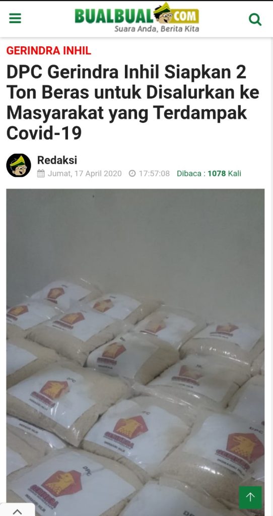 Hal itu dibuktikan dengan pemberitaan yang dimuat pada laman Bualbual.com pada 17 April 2020 dengan judul “DPC Gerindra Inhil Siapkan 2 Ton Beras untuk Disalurkan ke Masyarakat yang Terdampak Covid-19”.