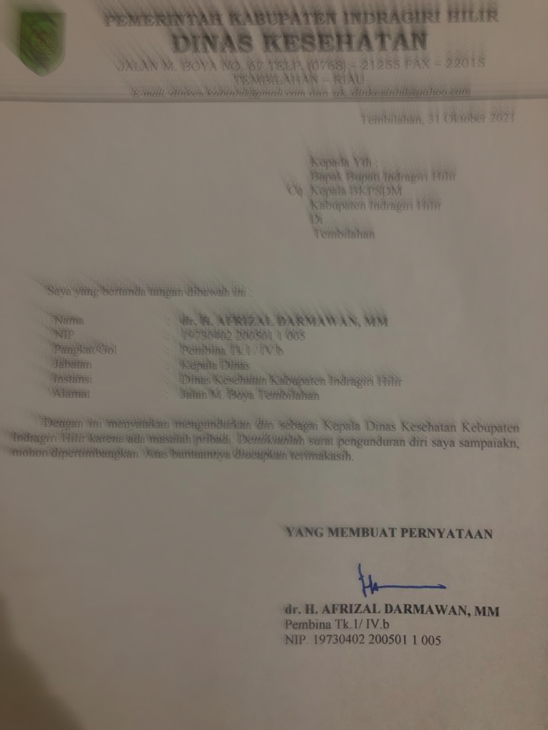 Surat pernyataan pengunduran diri Kepala Dinas Sehatan Inhil