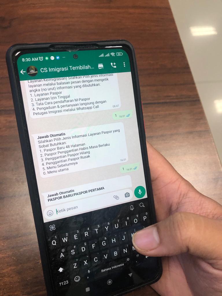 Melalui pesan WhatsApp ke nomor 0822-8537-1234, maka yang bersangkutan dapat mengetahui berbagai informasi-informasi layanan keimigrasian yang ada pada Kantor Imigrasi Tembilahan.