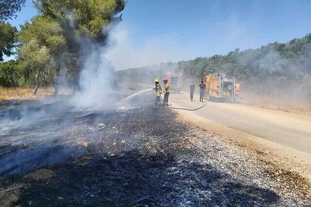 Petugas pemadam kebakaran Israel memadamkan kobaran api di Negev Barat akibat serangan balon pembakar dari Gaza, Palestina. Foto/Itzik Lugasi/KKL/JNF