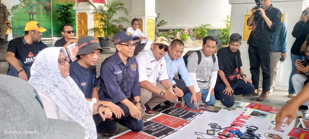 Batam. Mediawkspres. Co. Puluhan jurnalis di Kota Batam yang tergabung dalam Aliansi Jurnalis Kepulauan Riau (Kepri) melakukan aksi unjuk rasa, menolak Rancangan Undang-Undang (RUU) Penyiaran, di depan kantor Dewan Perwakilan Rakyat Daerah (DPRD) Batam, pada Senin, 27 Mei 2024.