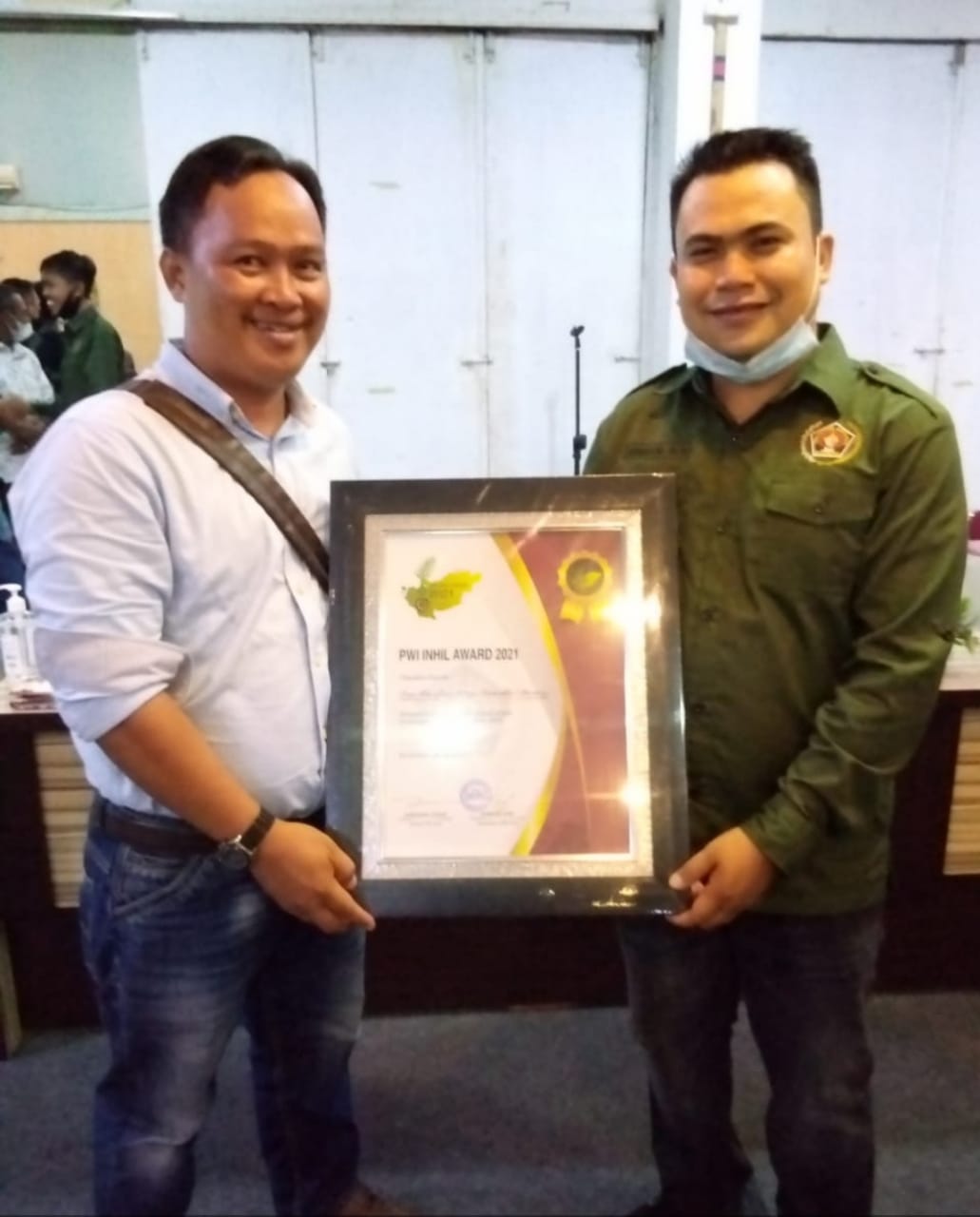 Penghargaan tersebut diterima Erwanto pada acara pelantikan pengurus Persatuan Wartawan Indonesia (PWI) dan Ikatan Keluarga Wartawan Indonesia (IKWI) Kabupaten Indragiri Hilir (Inhil) periode 2020-2023 pada Senin 5 April 2021 malam.