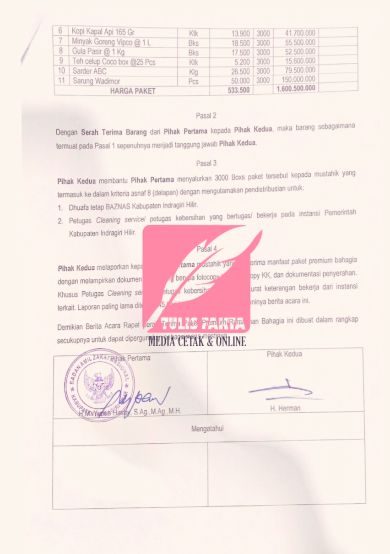 Dalam pasal 3, Pihak Kedua membantu Pihak Pertama menyalurkan 3.000 box paket tersebut kepada mustahik termasuk ke dalam 8 asnaf dengan mengutamakan pendistribusian untuk Dhuafa Tetap Baznas dan Petugas Cleaning Service petugas kebersihan yang bertugas bekerja pada instansi Pemerintah Kabupaten Inhil.
