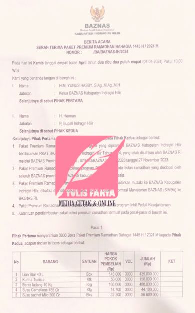 Hal itu tertuang dalam Berita Acara Serah Terima Paket Premium Ramadhan Bahagia 1445 Hijriah/2024, nomor /BA/BAZNAS-IH/2024 Tertulis dan ditandatangani, sebagai pihak pertama HM. Yunus Hasbi, SAg, MAg, sebagai Ketua Baznas Inhil dan pihak kedua H Herman dengan jabatan Pj Bupati Inhil.