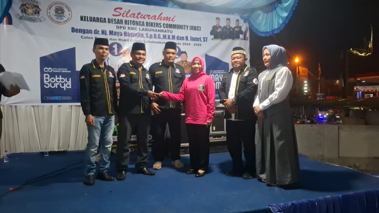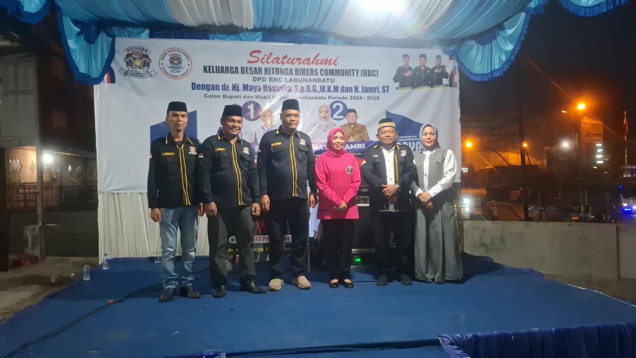 Pasangan Calon (Paslon) nomor urut 02 dr.Hj. Maya Hasmita, Sp.OG , M.KM dan H. Jamri, ST hadiri, hadiri dalam acara Silaturahmi Keluarga Besar DPD Ritonga Bikers Community (RBC) Labuhanbatu, dijalan Baru (seberang Galon) Sirandorung, Kec. Rantau Utara, Labuhanbatu, Rabu (13/11/2024) sekira pukul 20.30 wib.