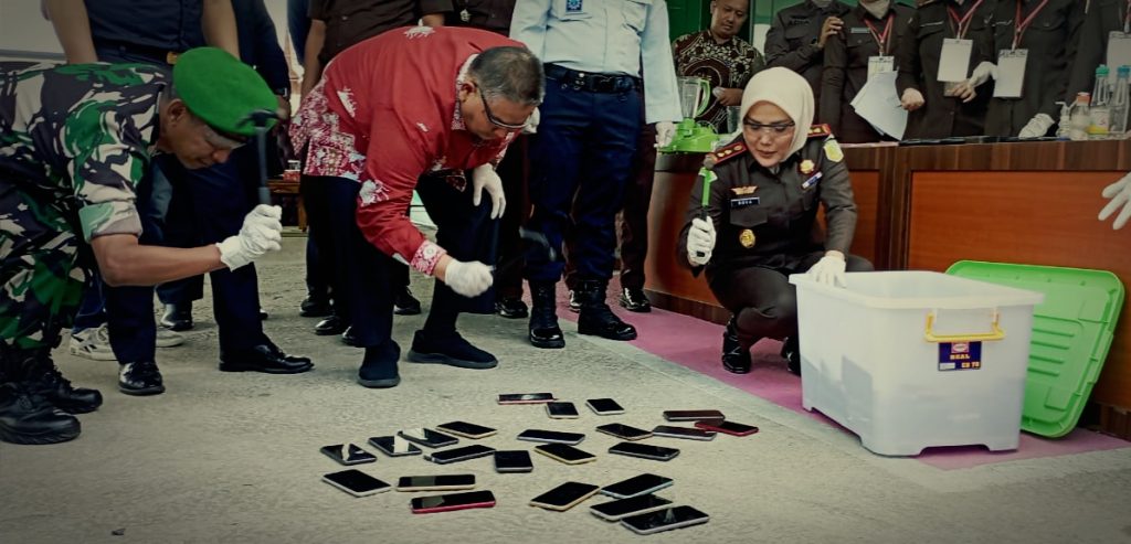 Handphone yang dimusnahkan dengan cara digilas alat berat.Lanjutnya, barang bukti yang dimusnahkan tersebut merupakan tindakan dari sejumlah 110 perkara yang telah berkekuatan hukum tetap (INKRACHT) berdasarkan putusan Pengadilan Negeri Indragiri Hilir pada bulan Februari sampai Mei.