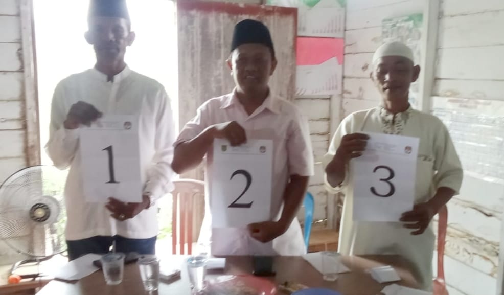 Dari hasil pengundian nomor urut terhadap 3 calon Kades Sungai Berapit, panitia Pilkades menetapkan nomor urut 1 Basyiruddin, 2 M Ihsah, dan nomor urut 3 Ediyanto.