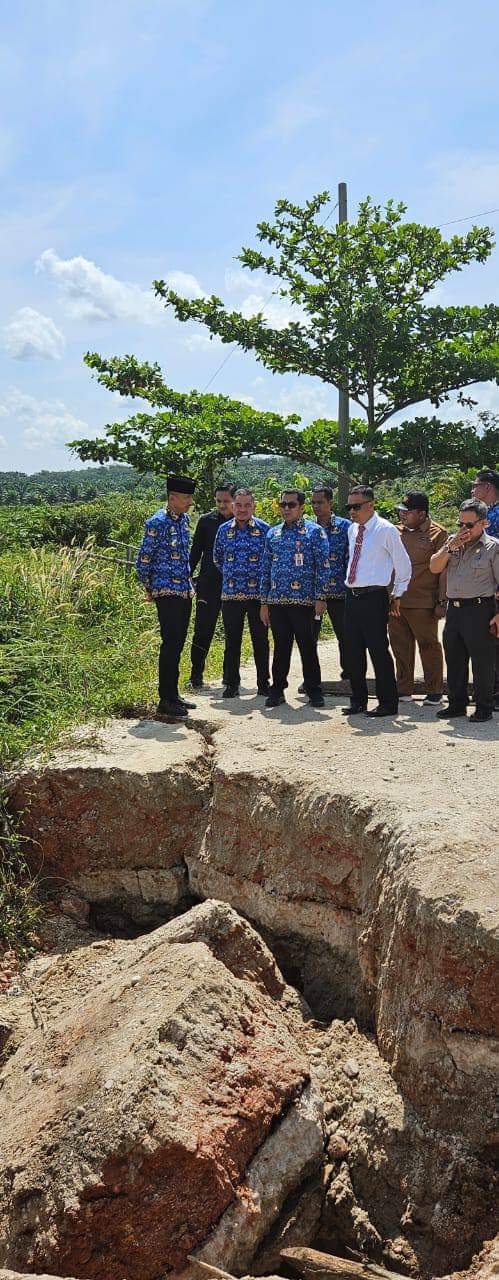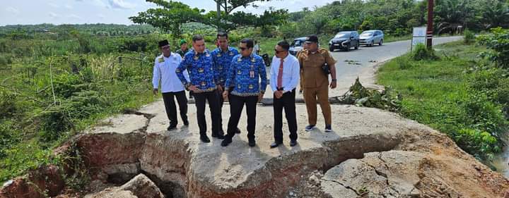 Kuansing- Kondisi jembatan yang ambruk di perbatasan Desa Muaro Sentajo dan Pulau Komang Kabupaten Kuantan Singingi (Riau) mendapat perhatian serius dari pemerintah daerah. Pada Senin, 11 November 2024, Pjs Bupati Kuantan Singingi, drg. Sri Sadono Mulyanto, M.Han., bersama Kepala Dinas PUPR, Zulkarnaen, ST, MT, Kabid Bina Marga, Faisal, ST, dan Camat Sentajo Raya, Hevi H Antoni, melakukan peninjauan langsung ke lokasi kerusakan.