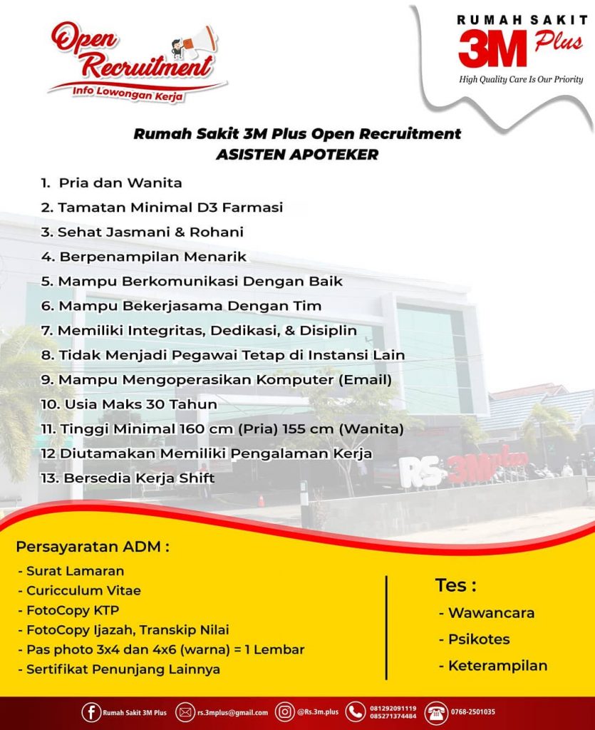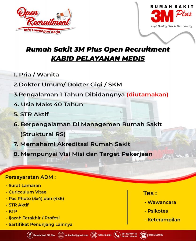 ARBIndonesia.com, INDRAGIRI HILIR – Rumah Sakit 3M Plus Tembilahan, Kabupaten Indragiri Hilir kembali membuka lowongan pekerjaan untuk bagian Kepala Bidang (Kabid) Pelayanan Media, dan Asisten Apoteker.