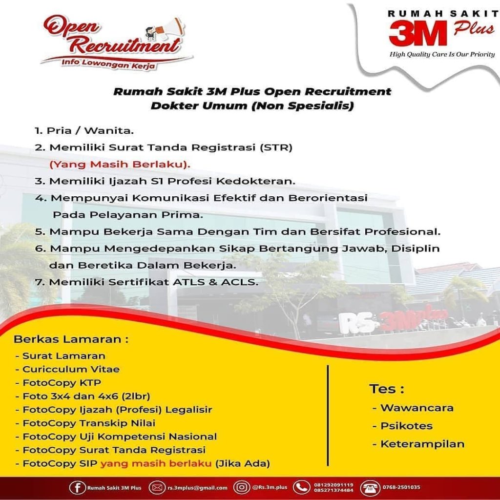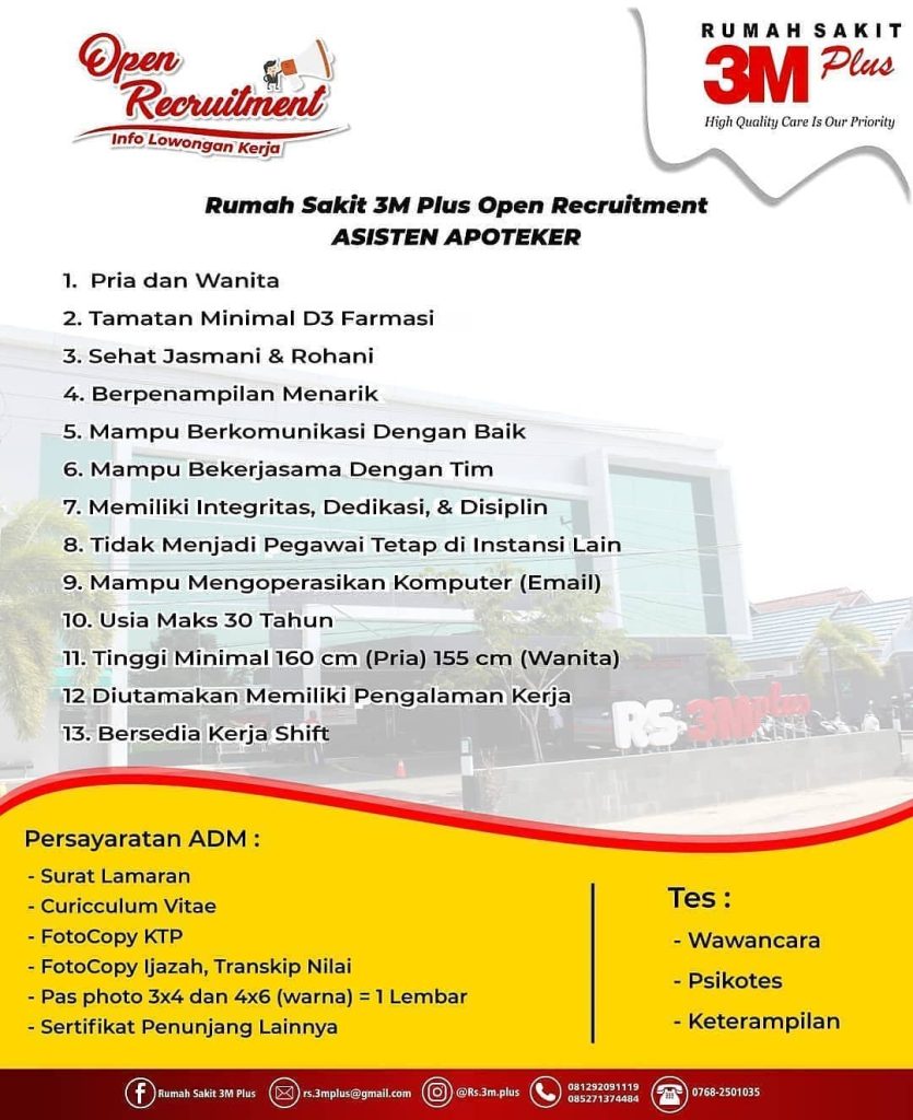 ARBIndonesia.com, INDRAGIRI HILIR – Rumah Sakit 3M Plus Tembilahan, Kabupaten Indragiri Hilir kembali membuka lowongan pekerjaan (lowker) pada bagian Asisten Apoteker dan Dokter Umum (Non Spesialis).