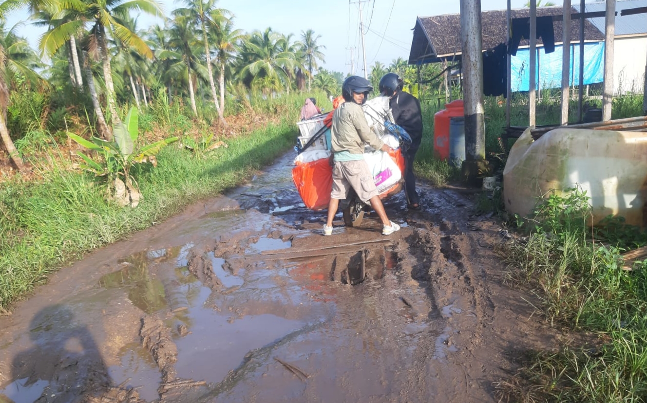 “Alhasil akses utama yang dilintasi masyarakat menjadi sangat sulit untuk dilalui, karena kondisi jalan yang penuh lubang yang digenangi air hingga lumpur,” ungkapnya.