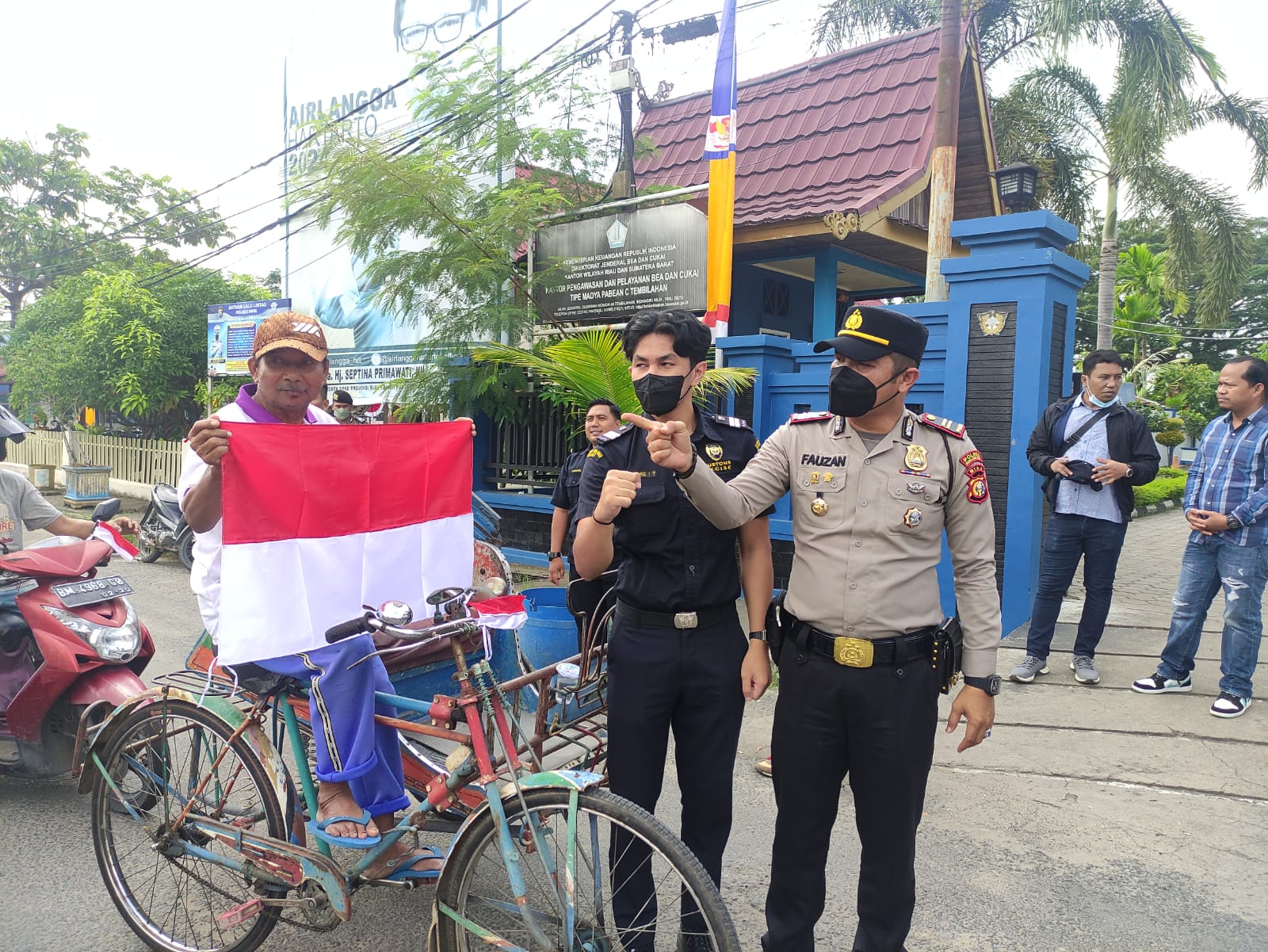 Ratusan bendera merah putih dibagikan 2 instansi yang kantornya berdampingan ini kepada pengendara sepeda motor dan becak.