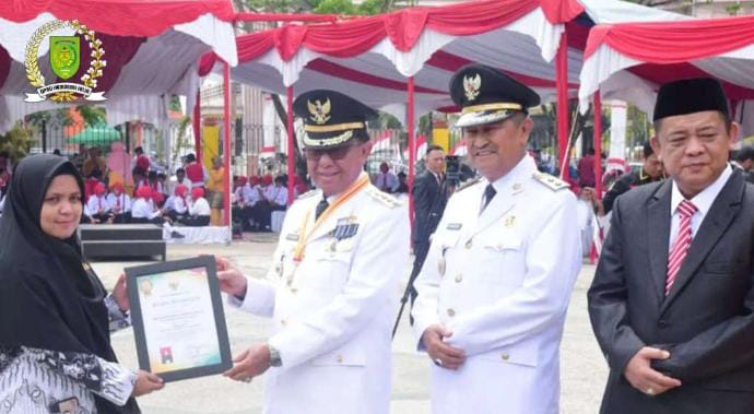 Acara dilanjutkan dengan penyerahan bingkisan kepada Veteran/Penjuang kemerdekaan dan memberikan penghargaan kepada Kepala Sekolah dan Guru berprestasi dan berdedikasi tingkat Kabupaten Inhil Tahun 2023 oleh Bupati Inhil didampingi Wakil Ketua DPRD Inhil dan Unsur Forkopimda Inhil. (Adv)